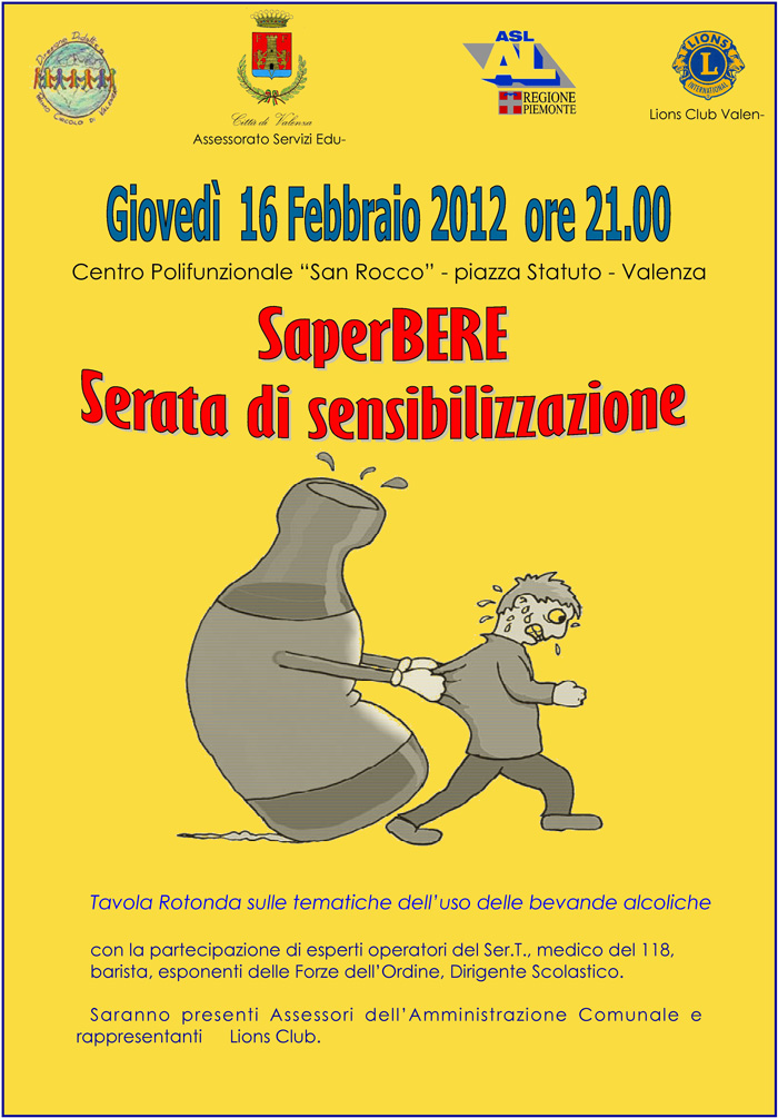 Alcol e Prevenzione : "SaperBERE" Serata di sensibilizzazione GIOVEDI' 16 FEBBRAIO 2012 alle ore 21.00 presso l'auditorio San Rocco - Valenza